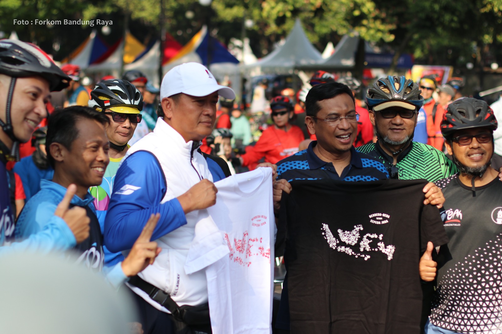 Selesai kegiatan Fun Bike, KoPeAh (Komunitas Sepeda Ahmadi) Chapter Bandung Raya, berkesempatan menyerahkan cinderamata kepada Plh Walikota Dr. Drs. H. Ema Sumarna, M.Si, dan Ketua DPRD Kota Bandung H. Tedy Rusmawan, AT., M.M. Penyerahan cinderamata dilakukan oleh Dikki Shadiq selaku Ketua Umum KoPeAh Indonesia, berupa masing-masing satu buah tshirt dengan gambar Peta Indonesia yang dibuat oleh rangkaian beragam sepeda.