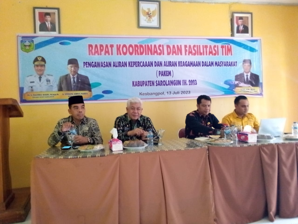 SAROLANGUN – Badan Kesatuan Bangsa dan Politik (Kesbangpol) Kabupaten Sarolangun menggelar Rapat Koordinasi (Rakor) dan Fasilitas Tim Pengawasan Aliran Kepercayaan dan Keagamaan Dalam Masyarakat (Pakem) tahun 2023. Rapat berlangsung di Aula kantor Kesbangpol pada kamis (13/7/2023) ini dibuka oleh Asisten I Setda Sarolangun Drs. Arif Ampera, ME.