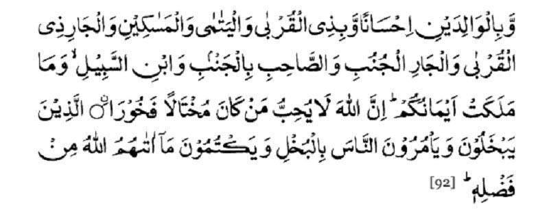 “Dan berbuat baiklah terhadap ibu-bapak, dan kaum-kerabat, dan anak-anak yatim dan orang-orang miskin, dan tetangga yang sesanak-saudara dan tetangga yang bukan-kerabat, dan hadai-taulan, dan orang musafir, dan yang dimiliki oleh tangan kananmu. Sesungguhnya, Allah tidak menyukai orang sombong dan pembual. Orang-orang yang bakhil dan menyuruh manusia lain supaya bakhil, dan menyembunyikan apa yang diberikan Allah kepada mereka daripada karunia-Nya.”(QS. An-Nisa, 4:37-38).